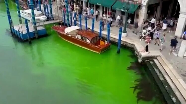 El gran Canal de Venecia, cerca del Puente de Rialto, se ha teñido este domingo de verde fluorescente sin que de momento se conozca el motivo, por lo que el delegado del Gobierno italiano, Michele di Bari, convocó una reunión urgente.